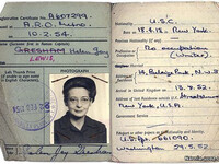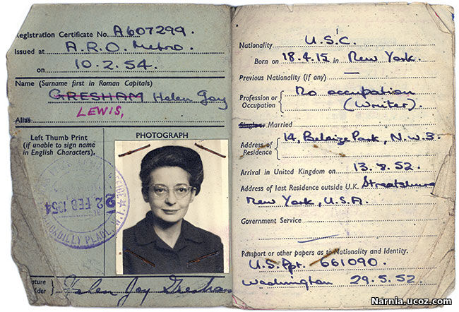 Davidman's residency permit shows the change in her last name. Joy Davidman, English registration document with photo...